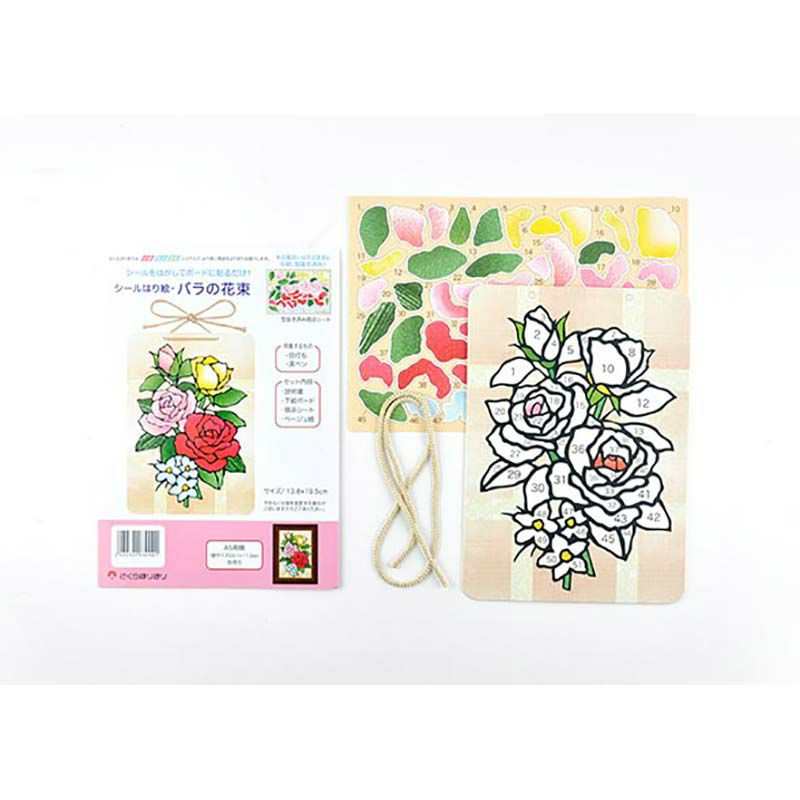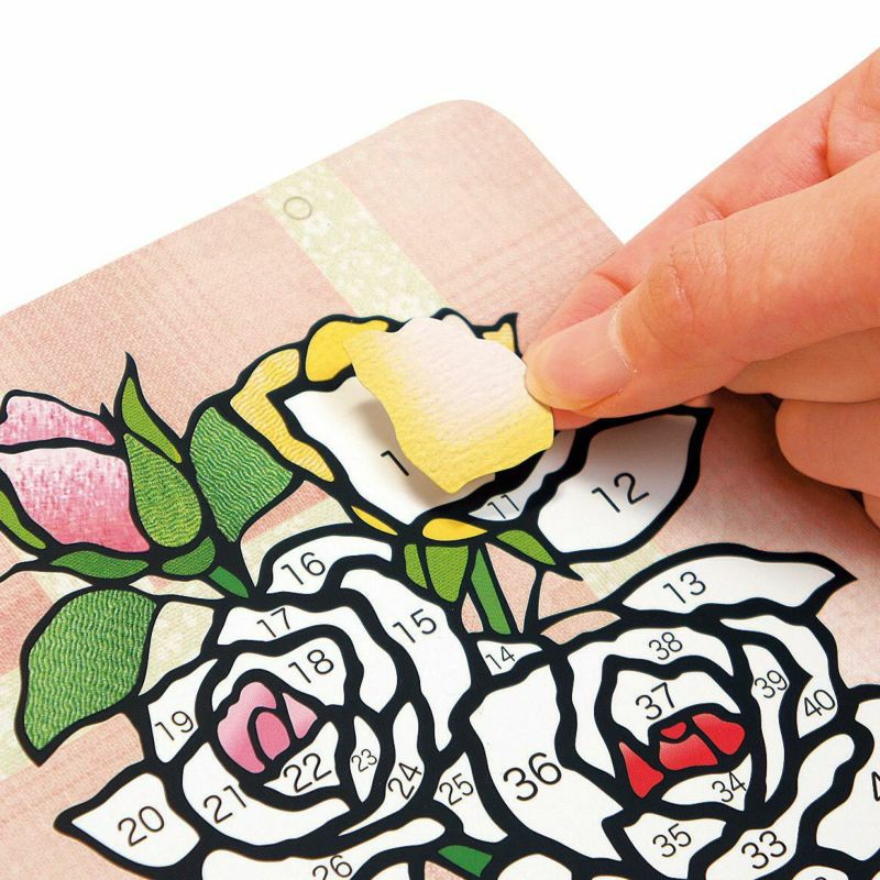 不用使用剪刀和膠水就能輕鬆製作的「玫瑰花束」貼畫。由於使用了模擬布質感的貼紙,成品彷彿是用布做成的貼畫。只需按照邊緣的編號將貼紙貼上去,非常簡單的步驟。另外,特殊加工的底畫即使失敗也可以重新貼上。