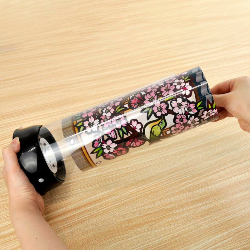 附上瓦屋頂,滿開的櫻花,以及可愛的綠繡眼,以剪紙風格的細膩圖案表現出豐富的情緒,令人想起古都。