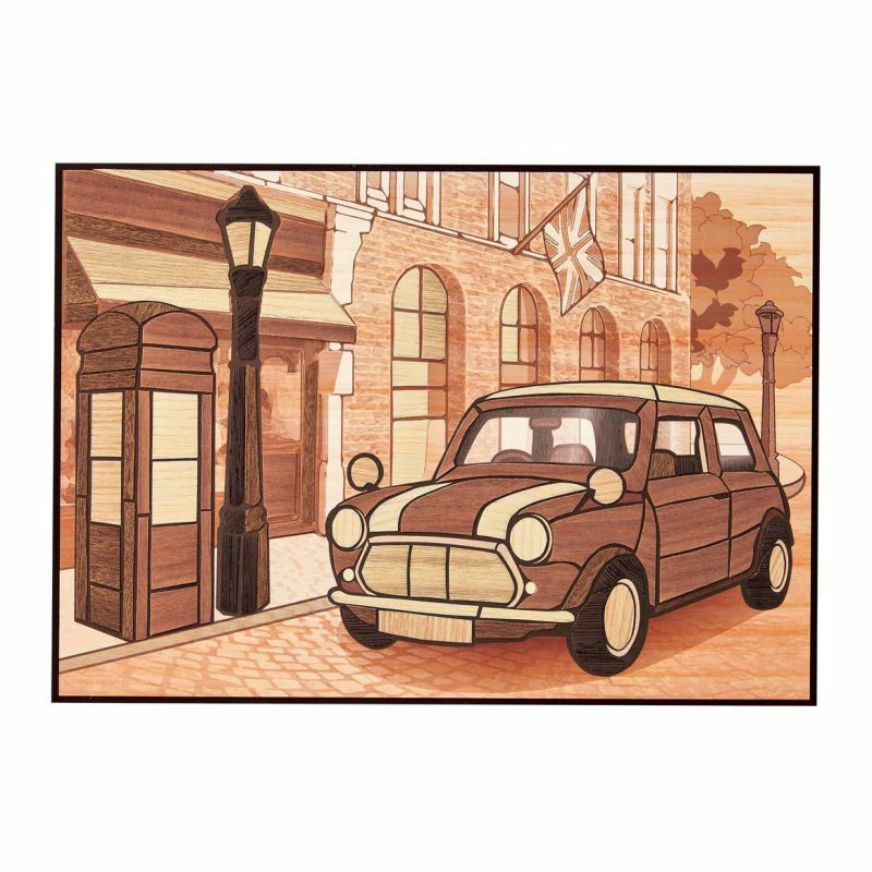 60年代的倫敦街景和可愛圓潤形狀的經典汽車,讓人不禁感到一絲懷舊與浪漫。使用沈穩的褐色色調繪製而成,非常適合作為裝飾室內的擺設。