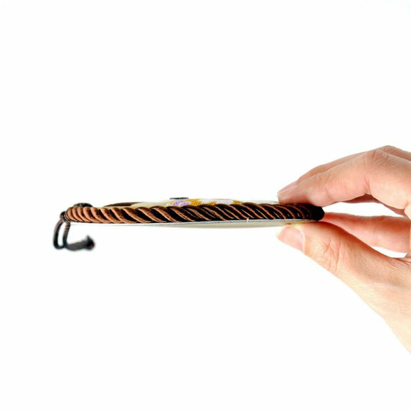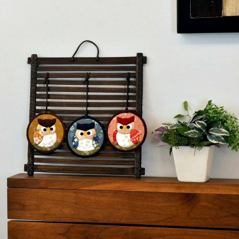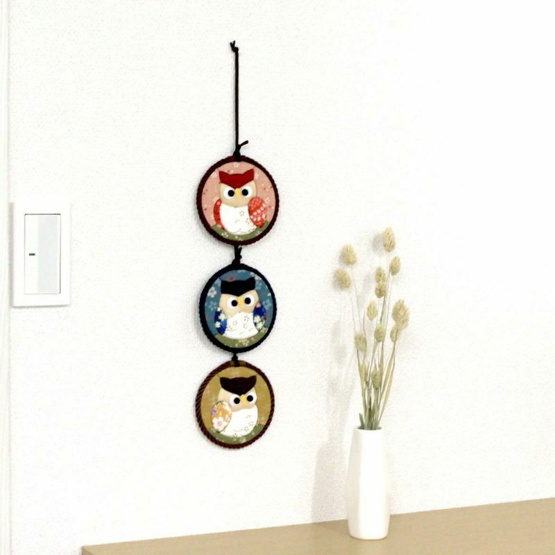 背景使用了櫻花圖案的和布,展現高雅與華麗。貓頭鷹的部分採用高級縮緬布作為點綴。