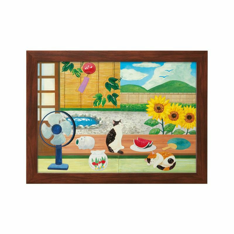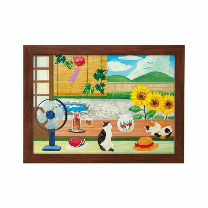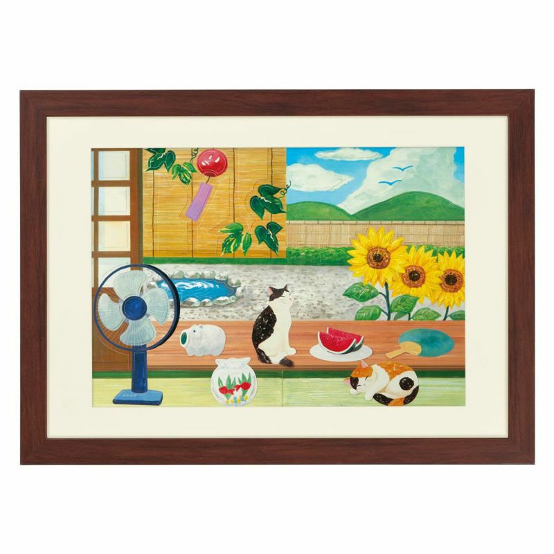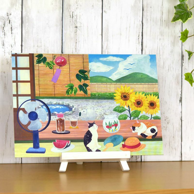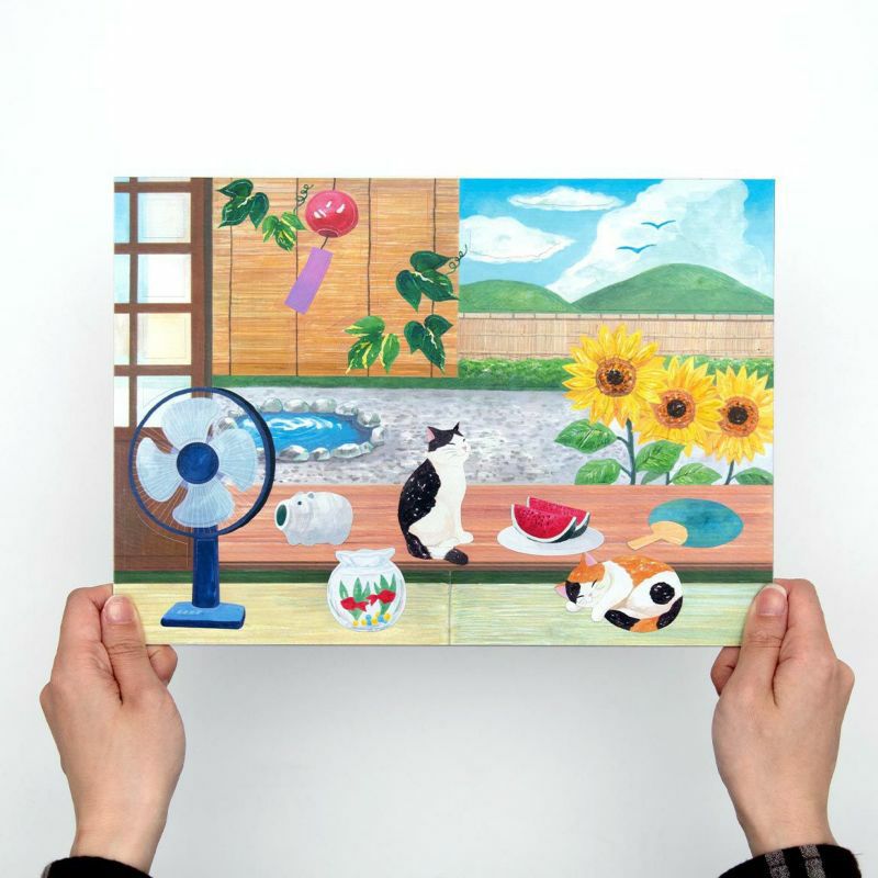 這是一系列用水彩畫風格的畫來享受貓咪四季變化的產品。因為是盛夏的畫風,所以融入了大量深綠色和清爽的藍色。另外,一幅畫中充滿了夏天的風物詩。