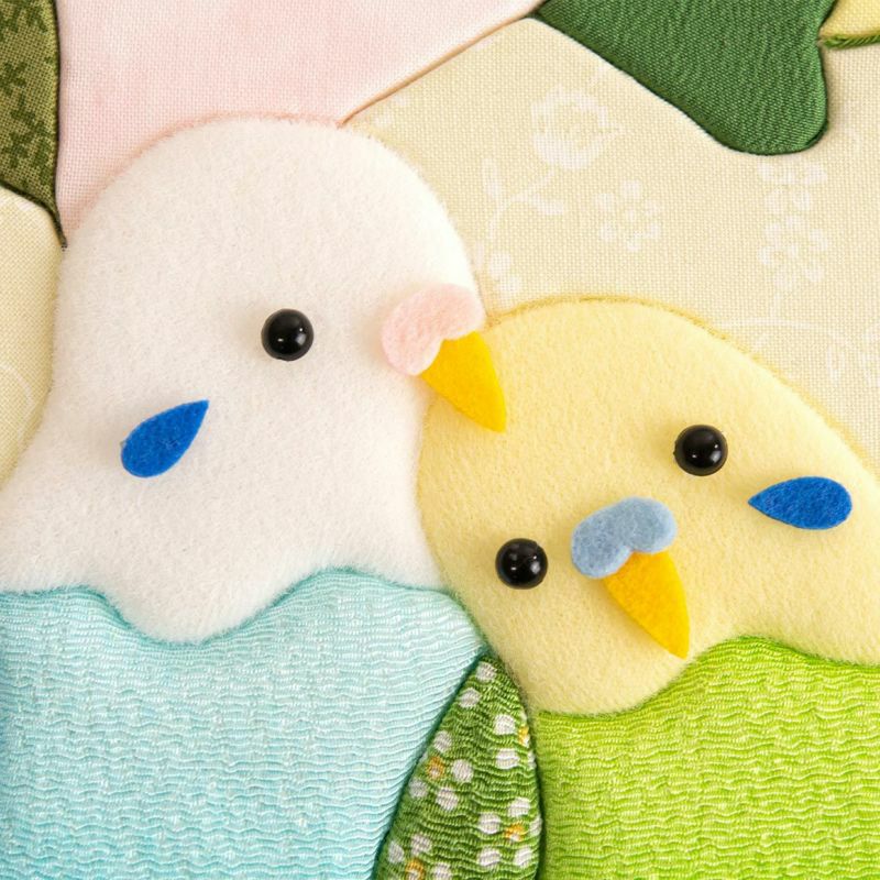 虎皮鸚鵡的腹部使用光澤美麗的縮緬布料。羽毛特別運用了花紋布料,增添色彩及可愛感。