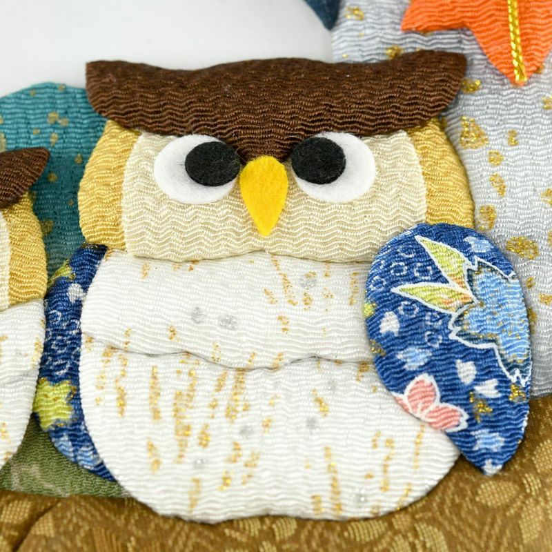 背景和貓頭鷹的身體部分使用了鮮豔的金色布料,成為華麗的裝飾點綴。