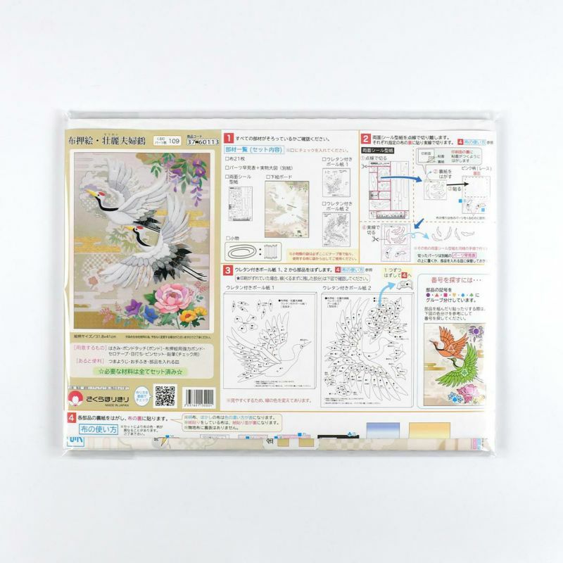 以白色為基調的柔和氣氛鶴圖案高雅而豪華。可廣泛用於長壽祝賀或結婚祝賀等。背景集結了藤、牡丹、菊、桔梗、萩及吉祥花。無論季節皆可展示。
