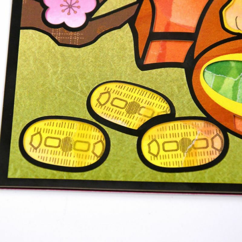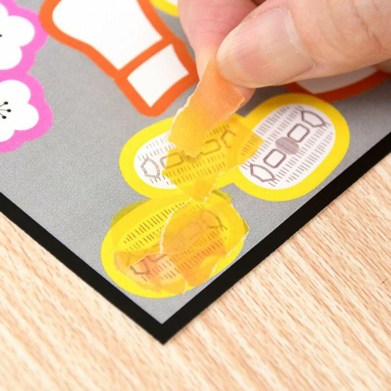 小判的圖樣等已預先印刷在底圖上,將空白的彩色貼紙貼上後,圖樣會浮現出來。