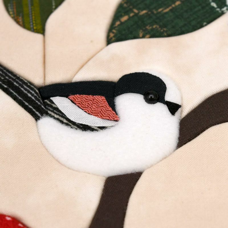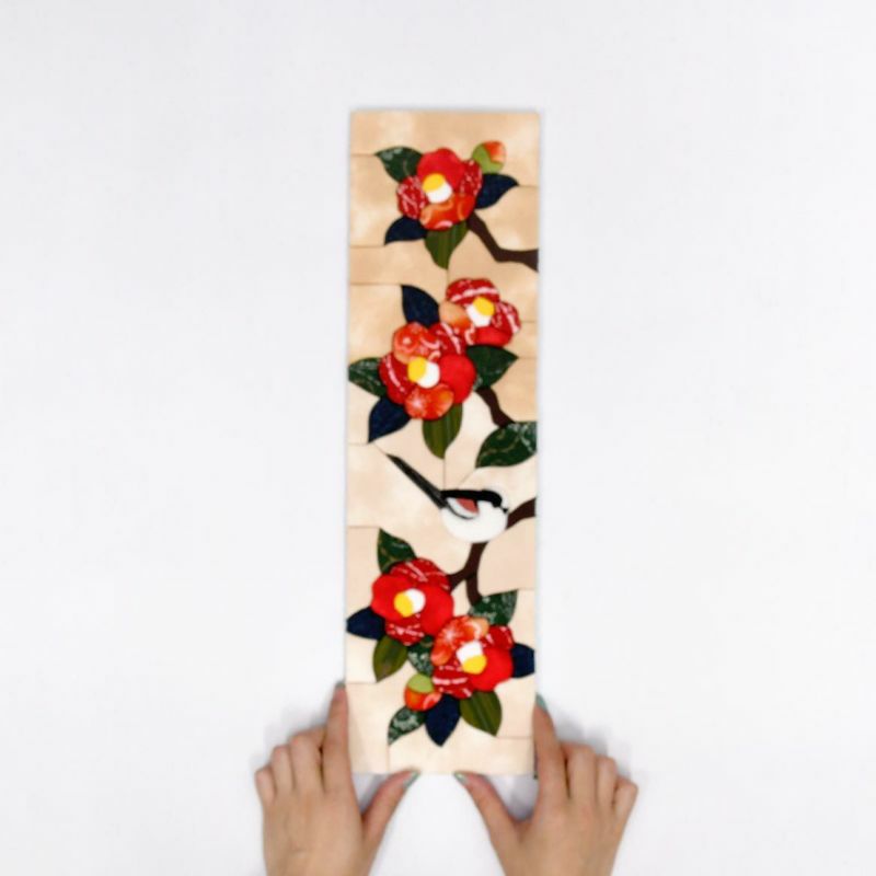 窗外風景圖案人氣商品「花與野鳥系列」。紅山茶花與圓形造型的可愛銀喉長尾山雀製作成掛軸風格。