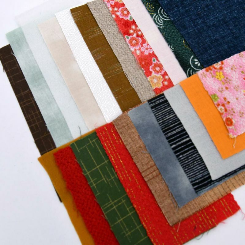 山茶花使用了三種不同的布料,將其鮮豔地呈現。花瓣和葉子部分加上了金色,表現出積雪融化的感覺。