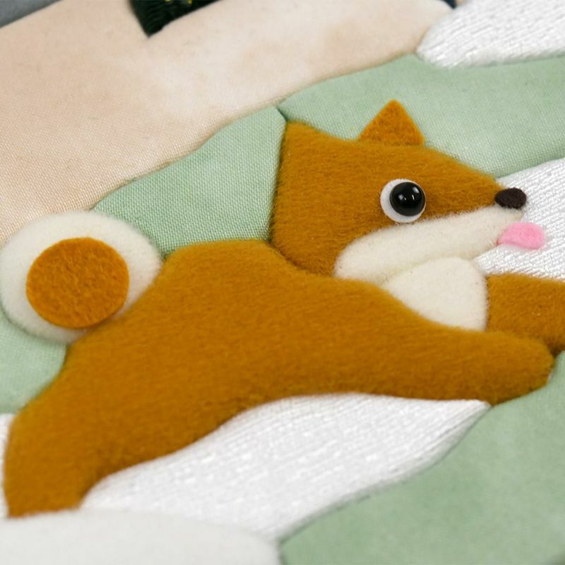 使用棉布表現柴犬的毛絨感。描繪了它在庭院中活潑跑來跑去的樣子,非常可愛。
