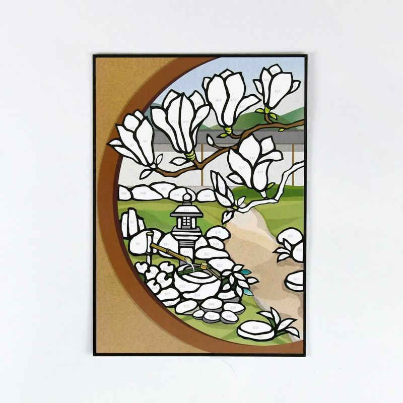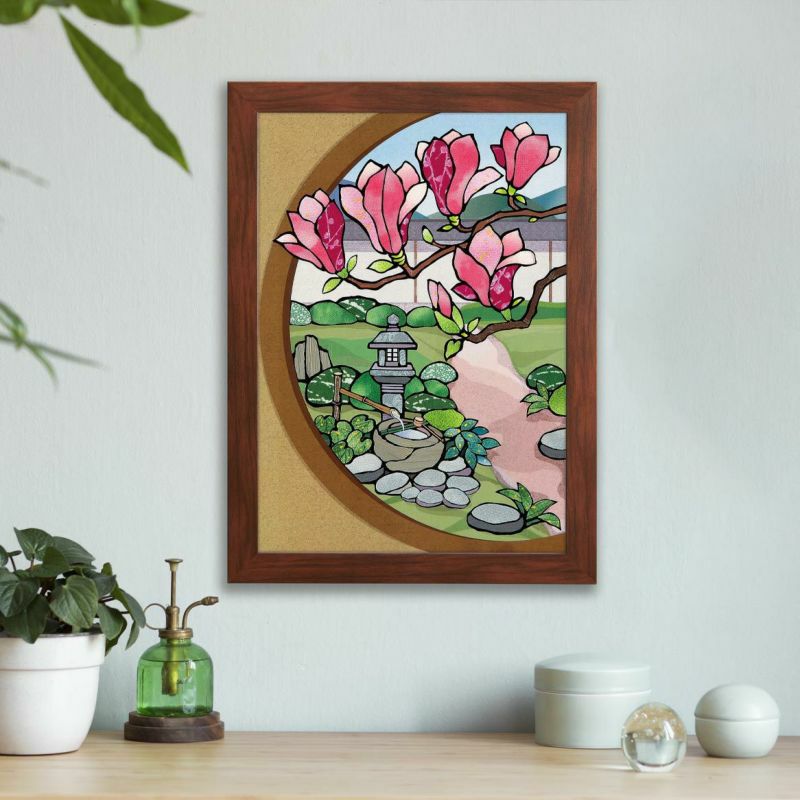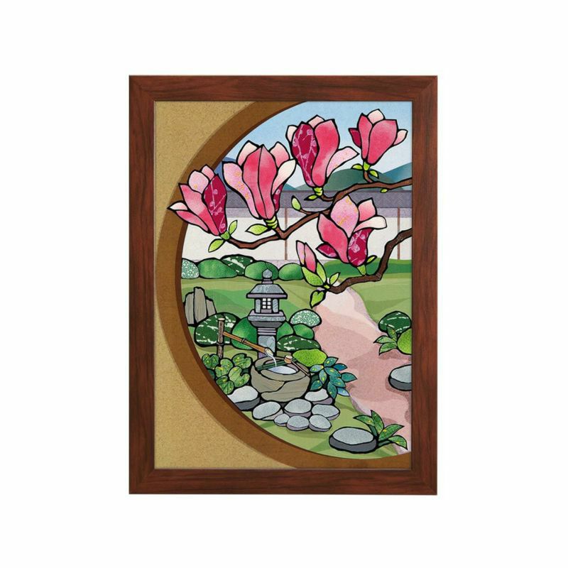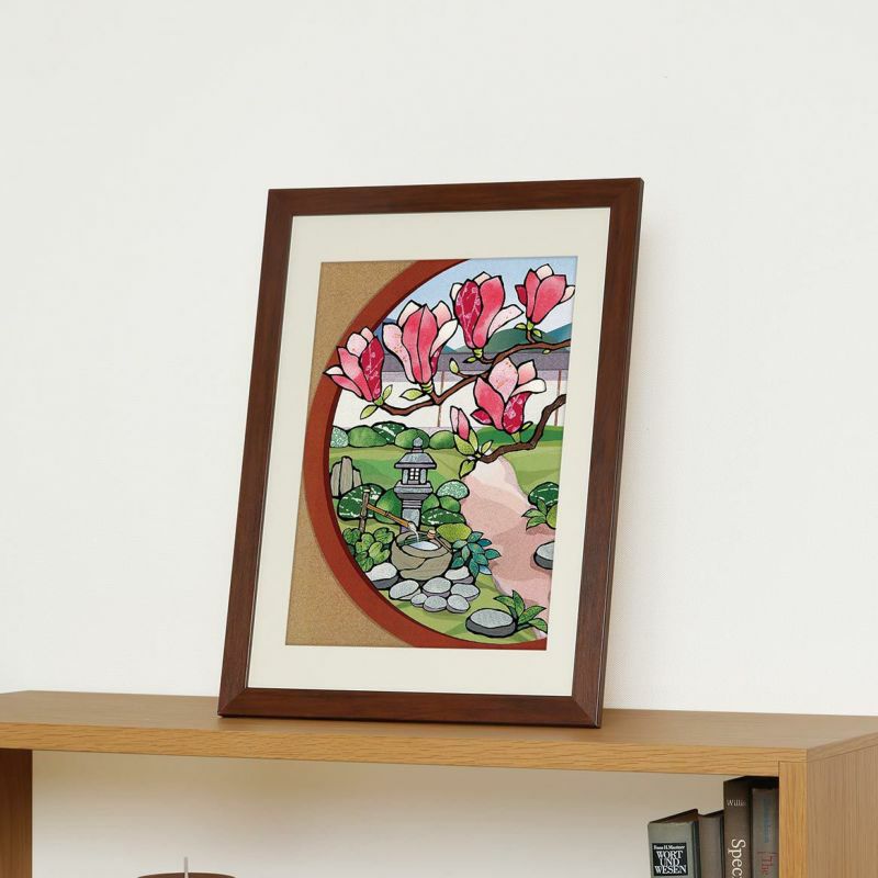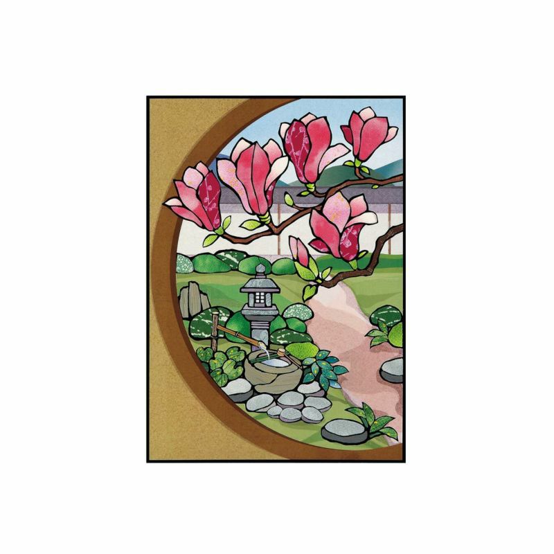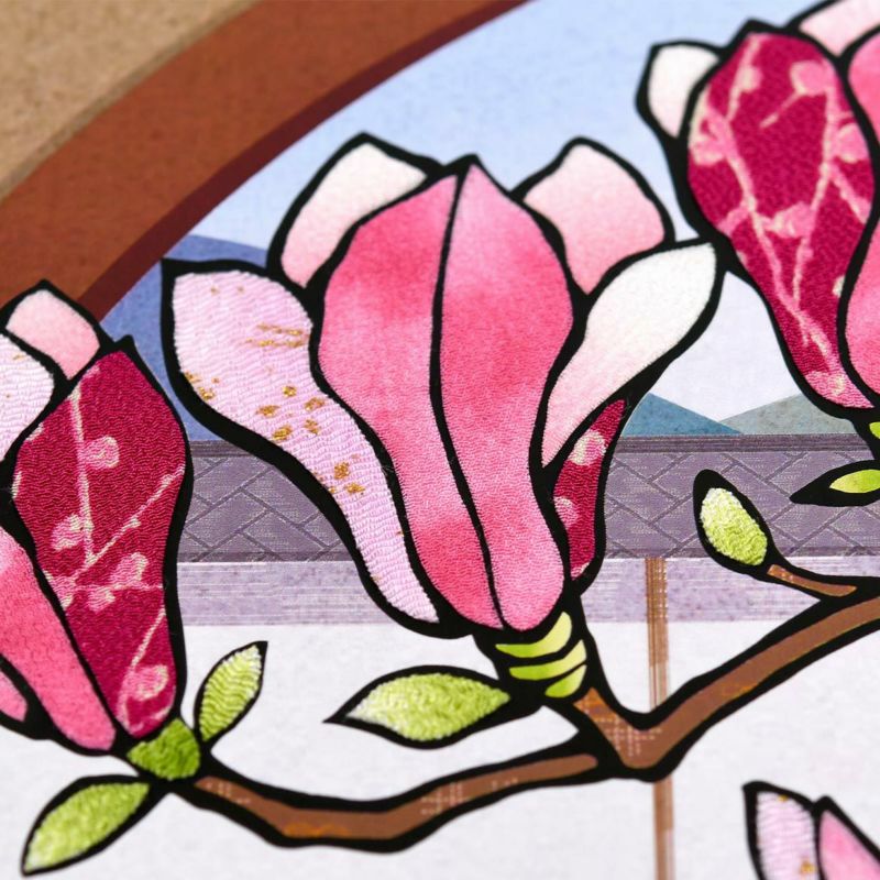 圓窗與四季折々的花系列。天空中美麗的紫木蓮為春天揭開序幕。讓無窗的牆壁變成美麗窗邊的充滿情緒的繪圖。