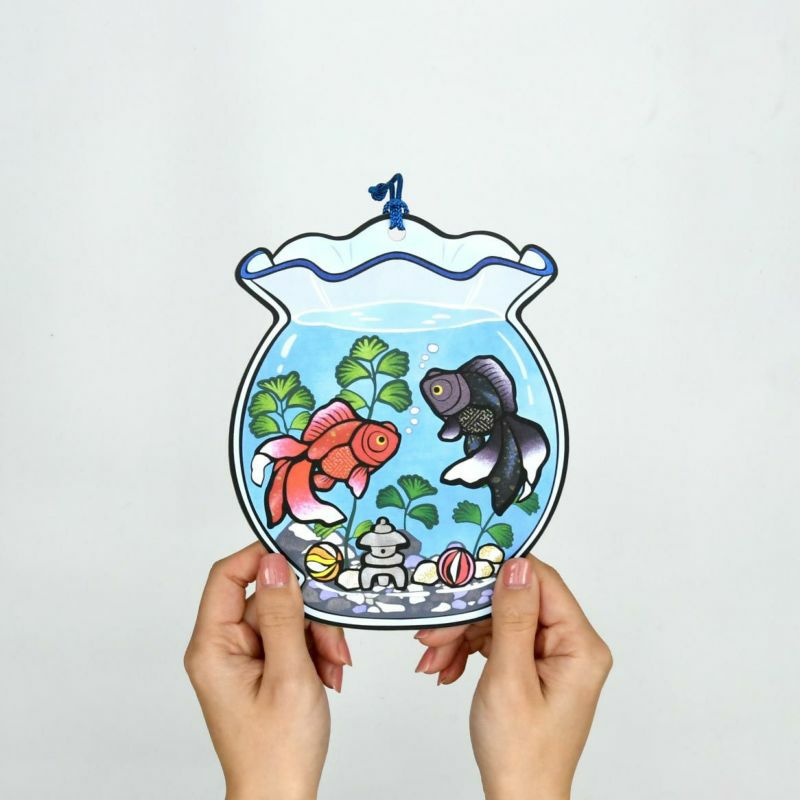 只需將紅色和黑色的金魚、水草和彩色的玻璃珠貼在魚缸造型的卡紙上,就能製作出涼爽的壁飾。