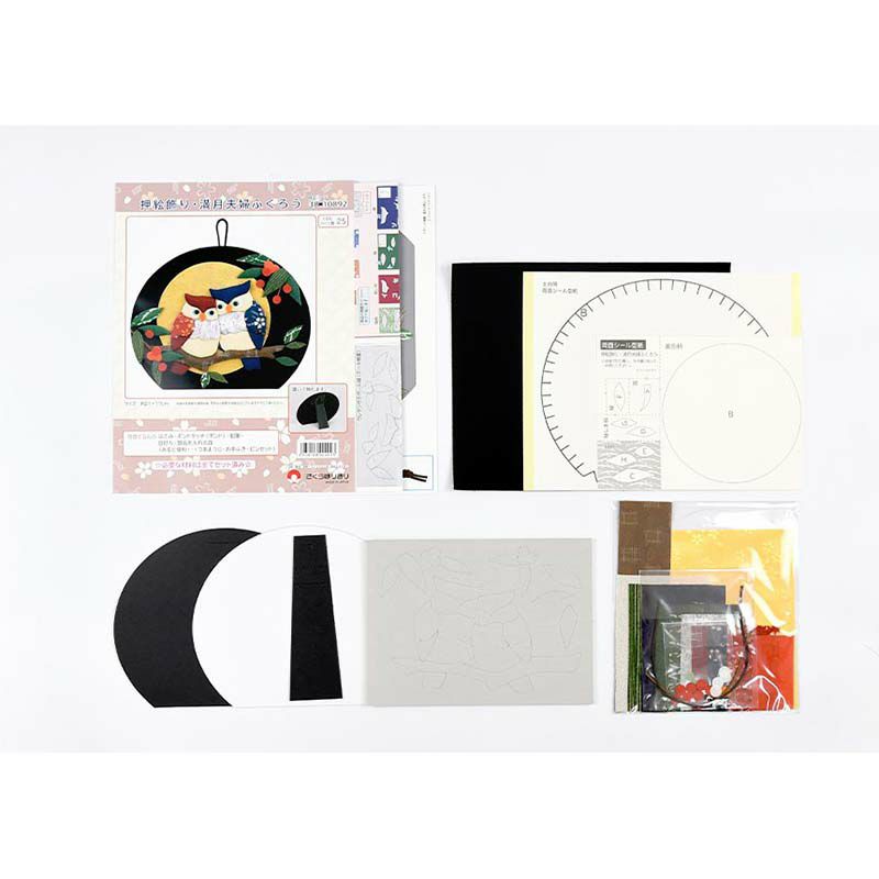 在大大的滿月下親密依偎的貓頭鷹。吉祥且溫柔氣氛的貓頭鷹可以裝飾在門口或房間中,盡情享受吧。