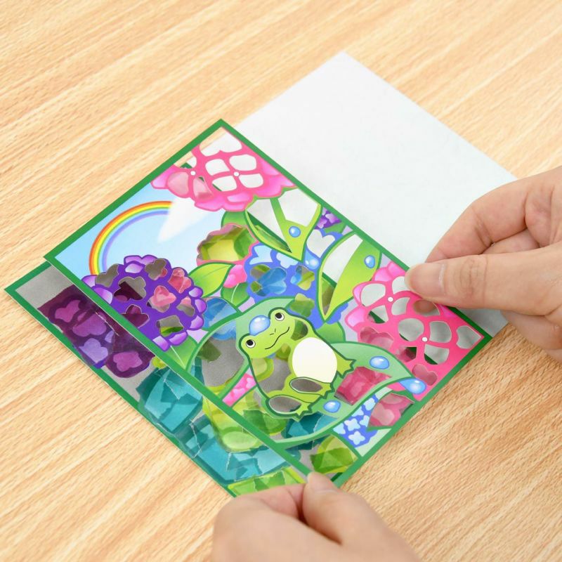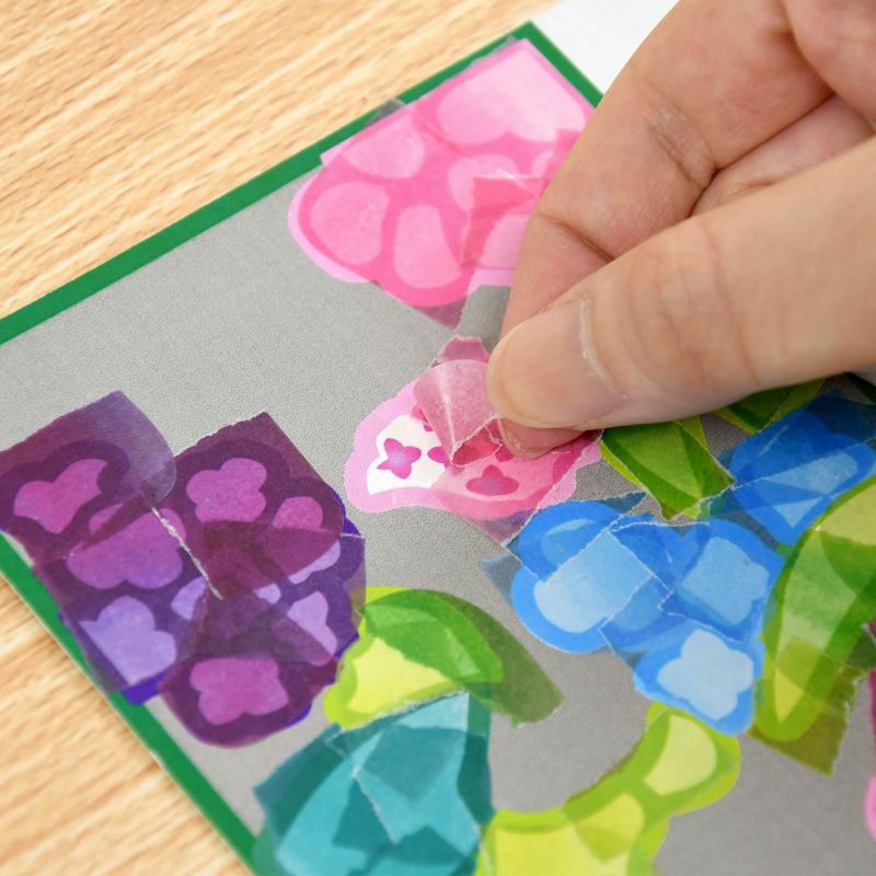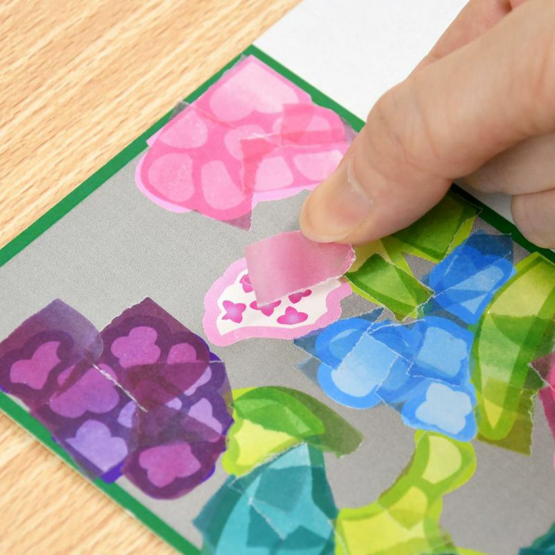 使用透明材質的貼紙,即使是相同的顏色,不同的撕裂大小和重疊方式也會改變氣氛。