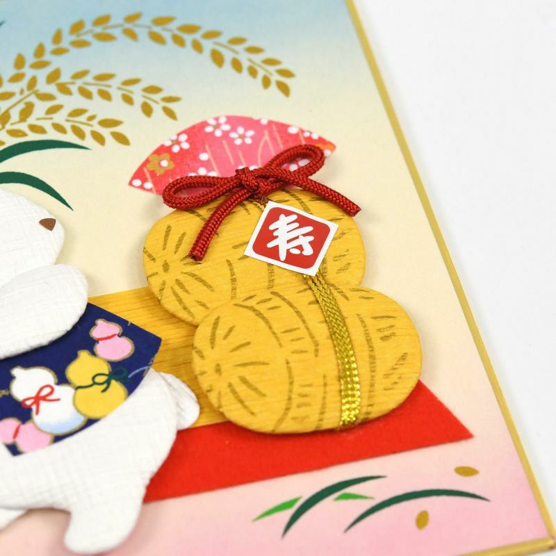 京都的工匠一個個用紮染的彩紙,柔和印象的和紙壓花來裝飾。扛著稻穗的兔子,象徵五穀豐收,帶來福氣。