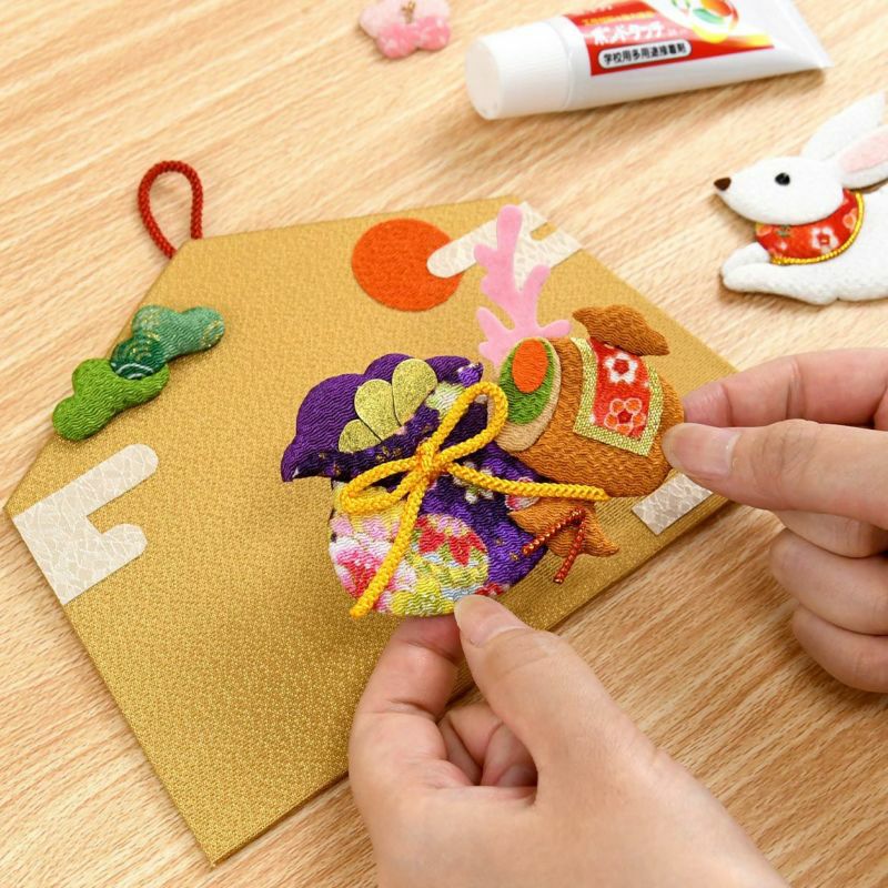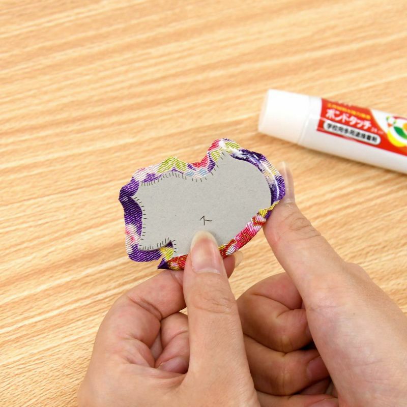 绘马的底座也可以用布料手工制作。为了让图案充分黏贴,选择了与胶水相容性良好的材料。