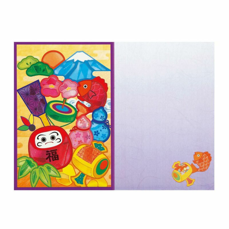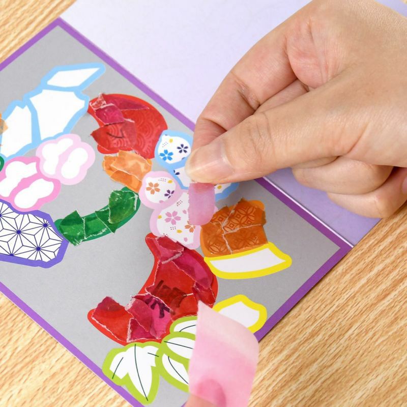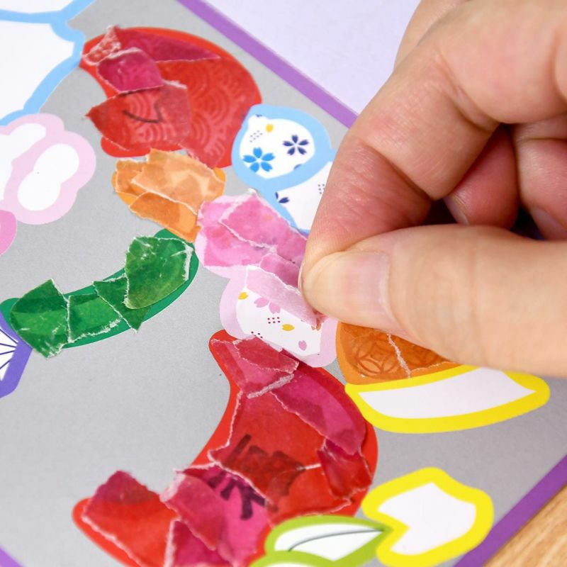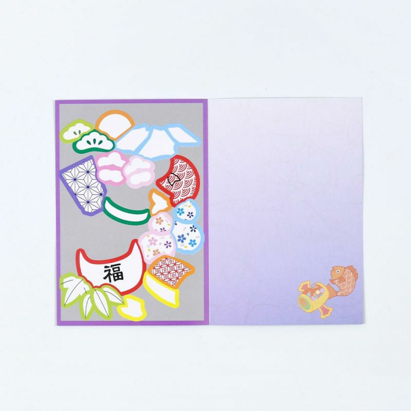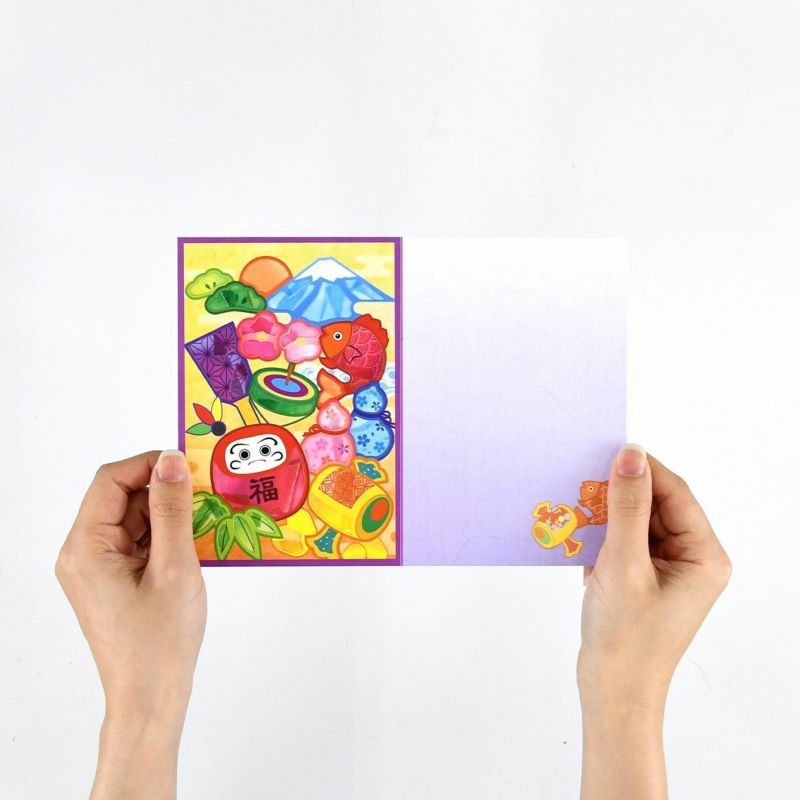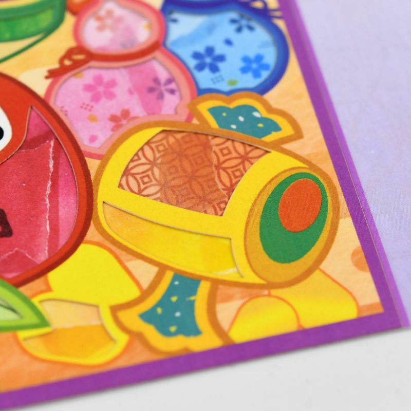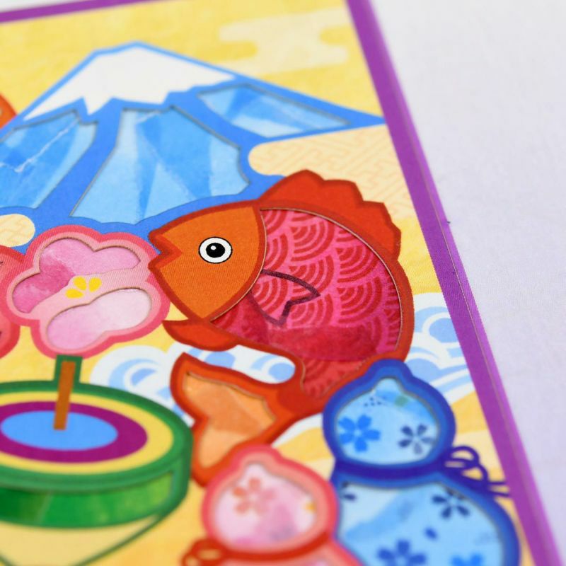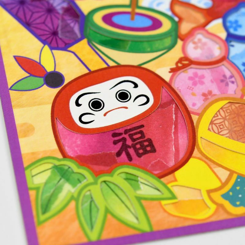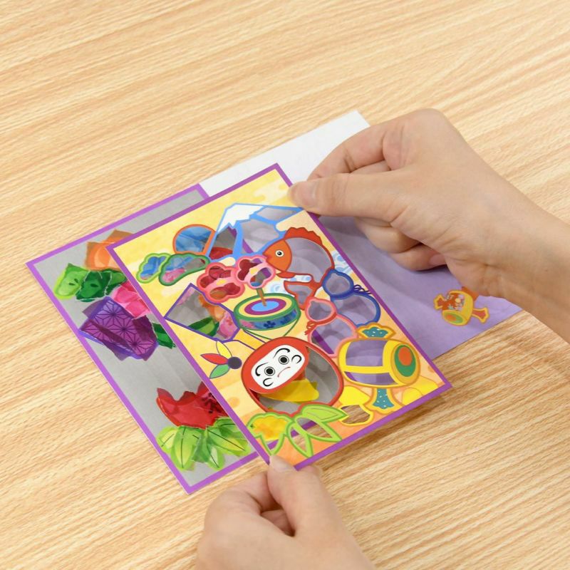 羽子板和小槌的圖案等已經預先印刷在底圖上。貼上貼紙後,圖案會透過使完成品更加華麗。