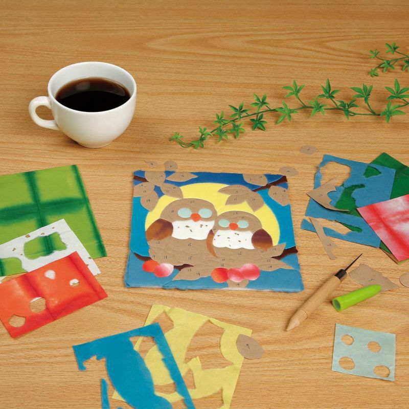 使用每片都是匠人染製的國產和紙。使用「板締染」或「暈染」技法,並利用15張和紙來表現貓頭鷹。
