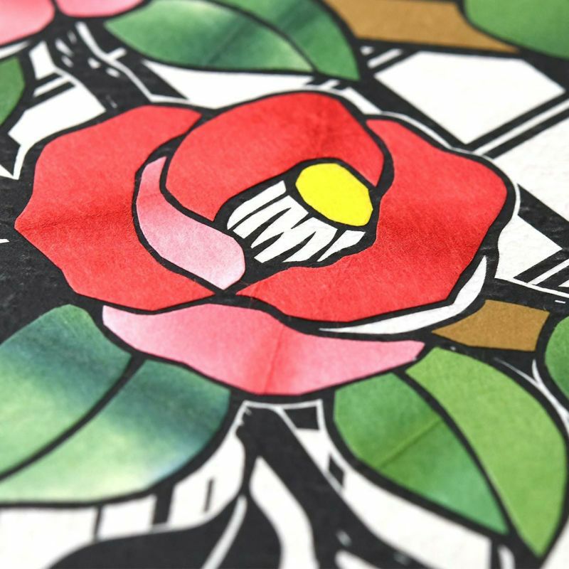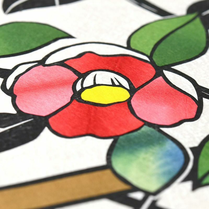 利用和紙的質感,細膩地表現出山茶花的色彩。點亮燈光時,葉脈等細節會浮現出來。