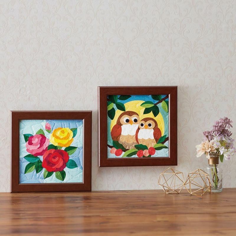 只需貼上刺繡線,即可輕鬆製作出光澤美麗的畫作。療癒的貓頭鷹親子形象。「貓頭鷹」具有「福來・不苦勞」的諧音,是一種吉祥的圖案。