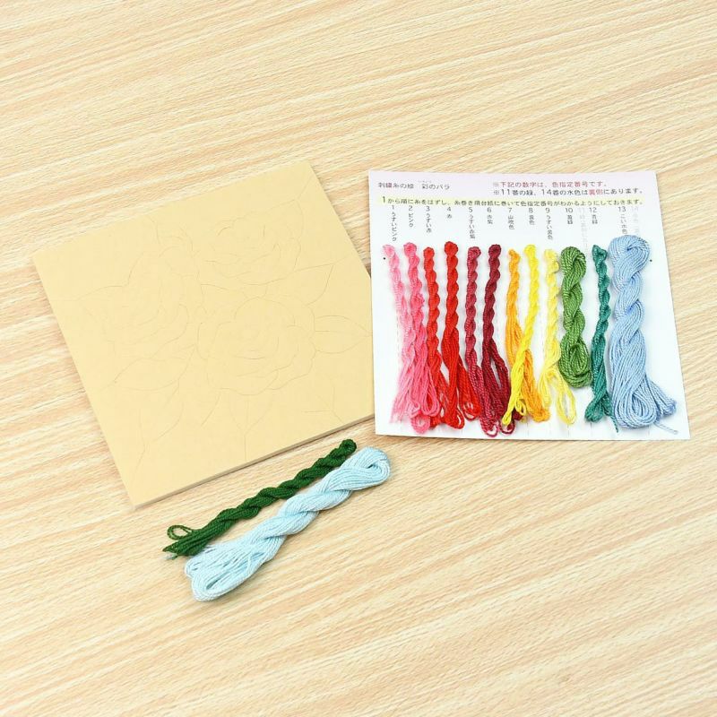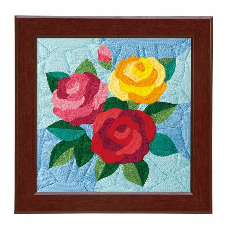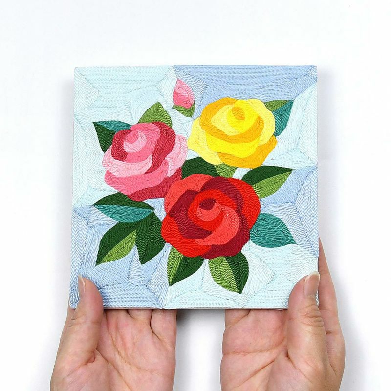 只需將刺繡線粘貼即可輕鬆製作出光澤感精美的畫。玫瑰的不同顏色有不同的花語:「紅色:愛情、美、激情」、「粉紅色:高雅、感動、溫暖的心」、「黃色:獻身、友情、和平」。