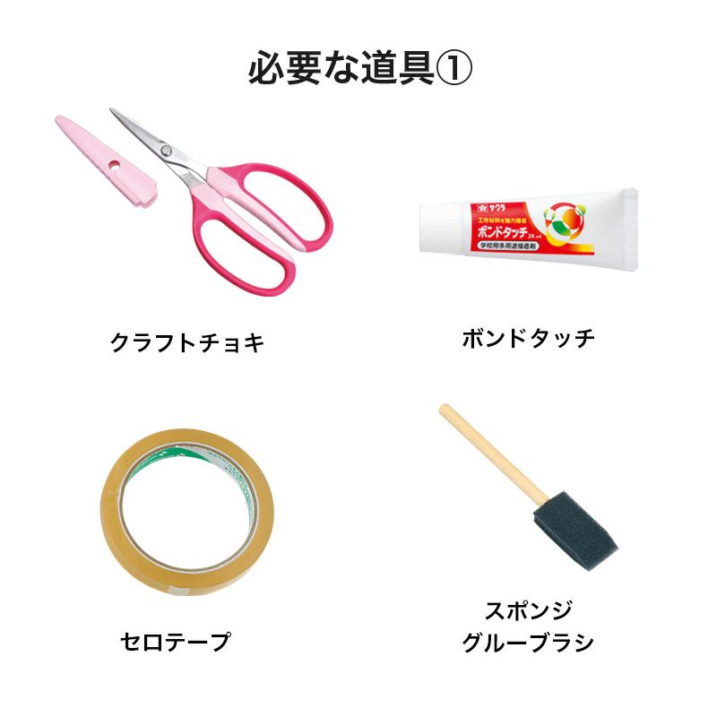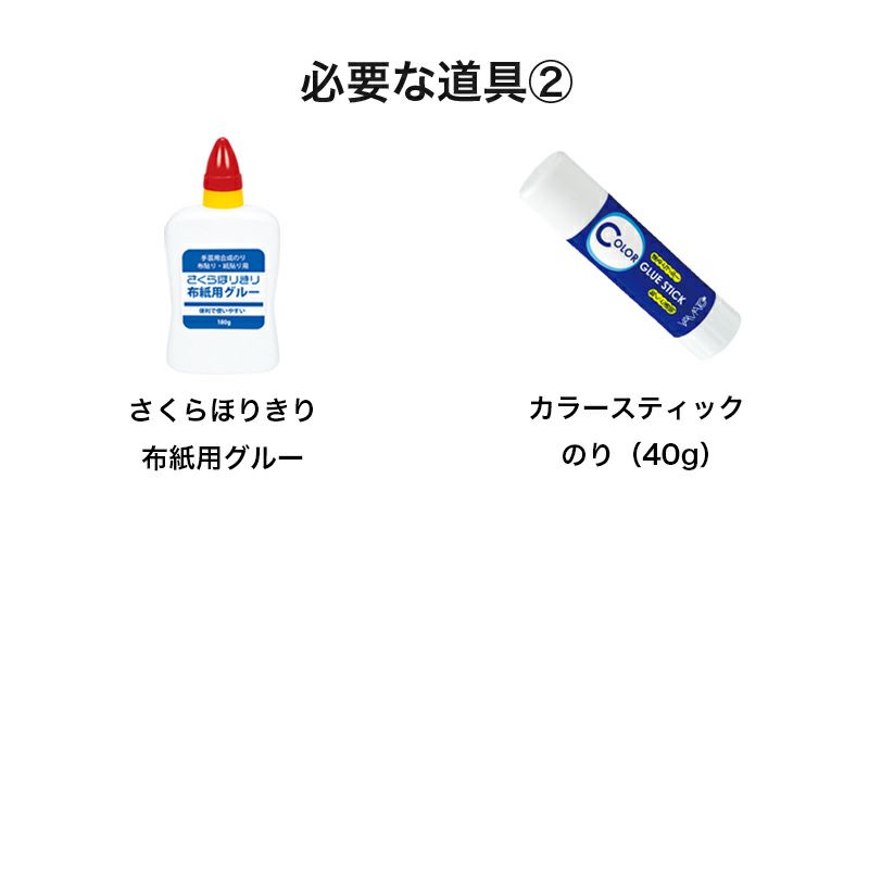 - 剪刀、透明膠帶、釘書機、Bond Touch、櫻花堀切布紙用膠水、海綿膠刷(或彩色膠棒)