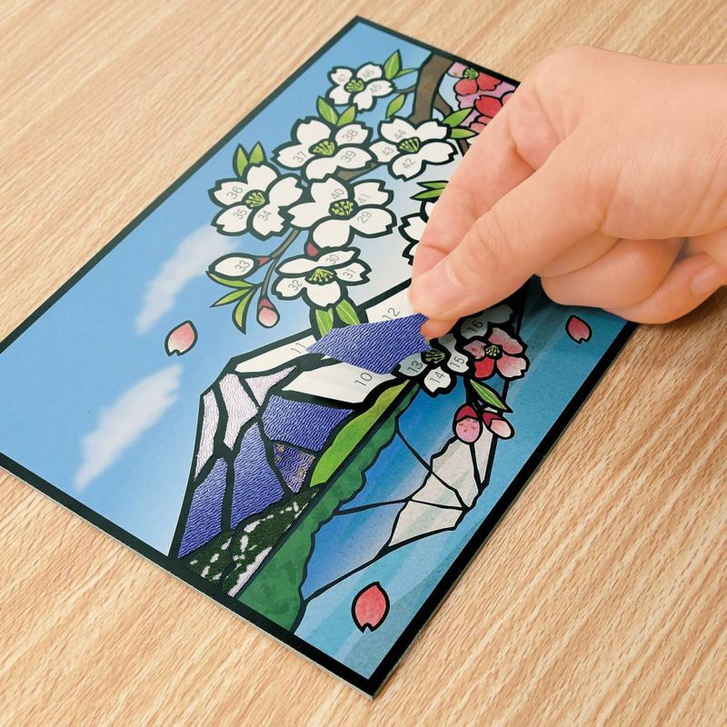 湖面倒影等細節部分已事先印刷在底圖上。製作主要的櫻花和富士山。