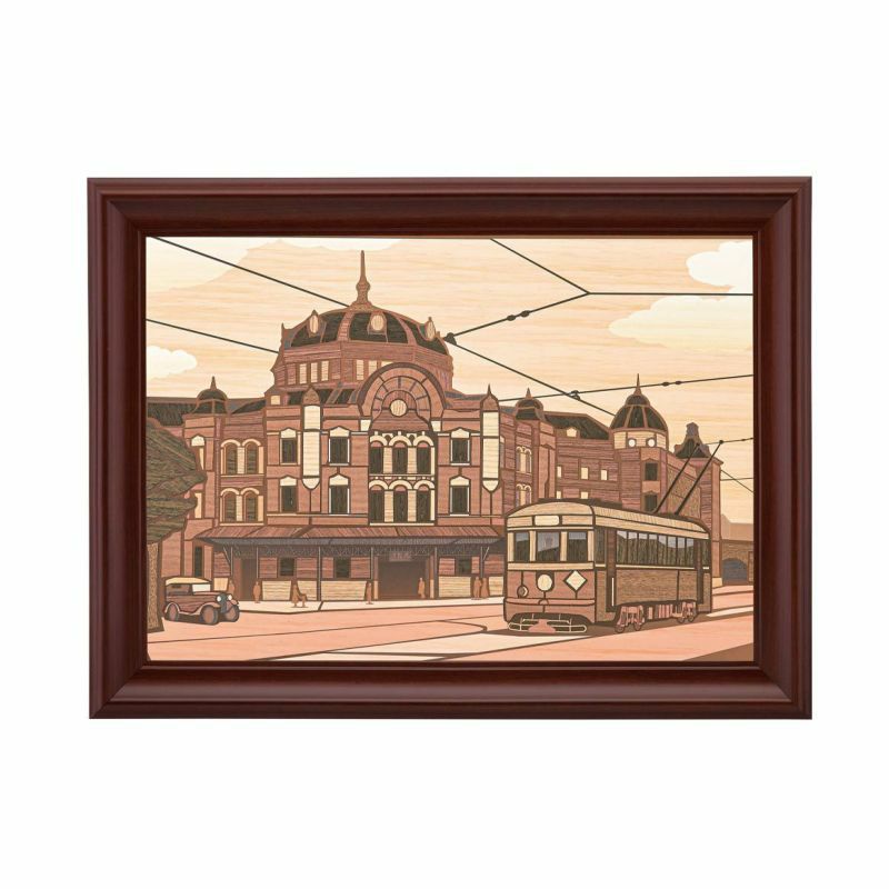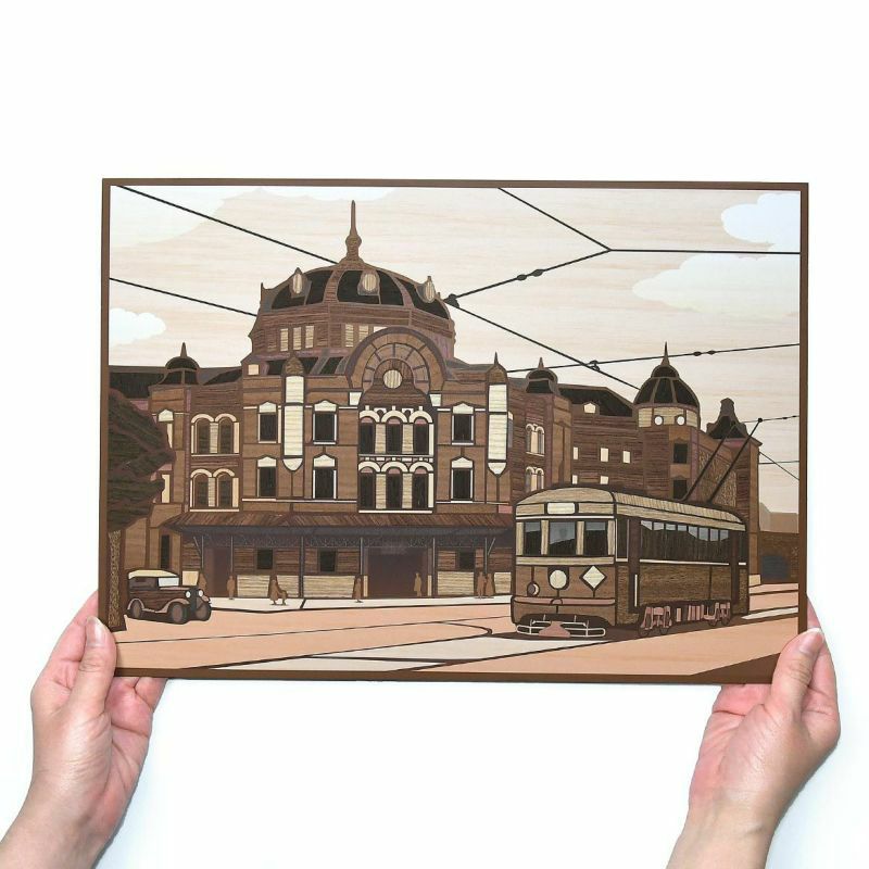 路面電車行駛,昭和初期的東京車站。運用了木材質感的褐色圖像景色,讓您感覺如同觀賞古照片般的樂趣。