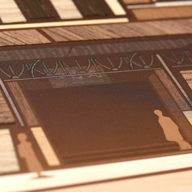 利用日本引以為傲的技術,使用7片0.1mm薄切的天然木片,製成具有深度和立體感、高完成度的作品。