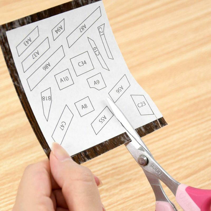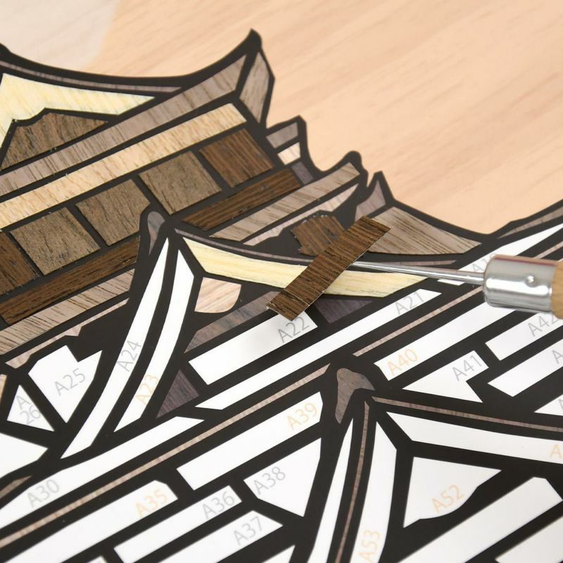 - 撕下已剪好的木片的底紙,按照草圖板的指定編號貼上。