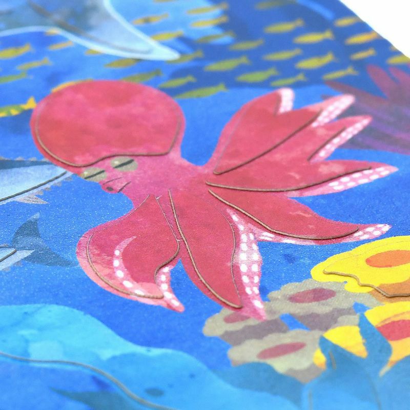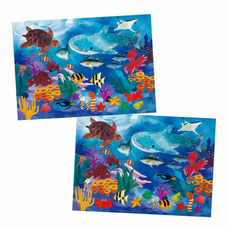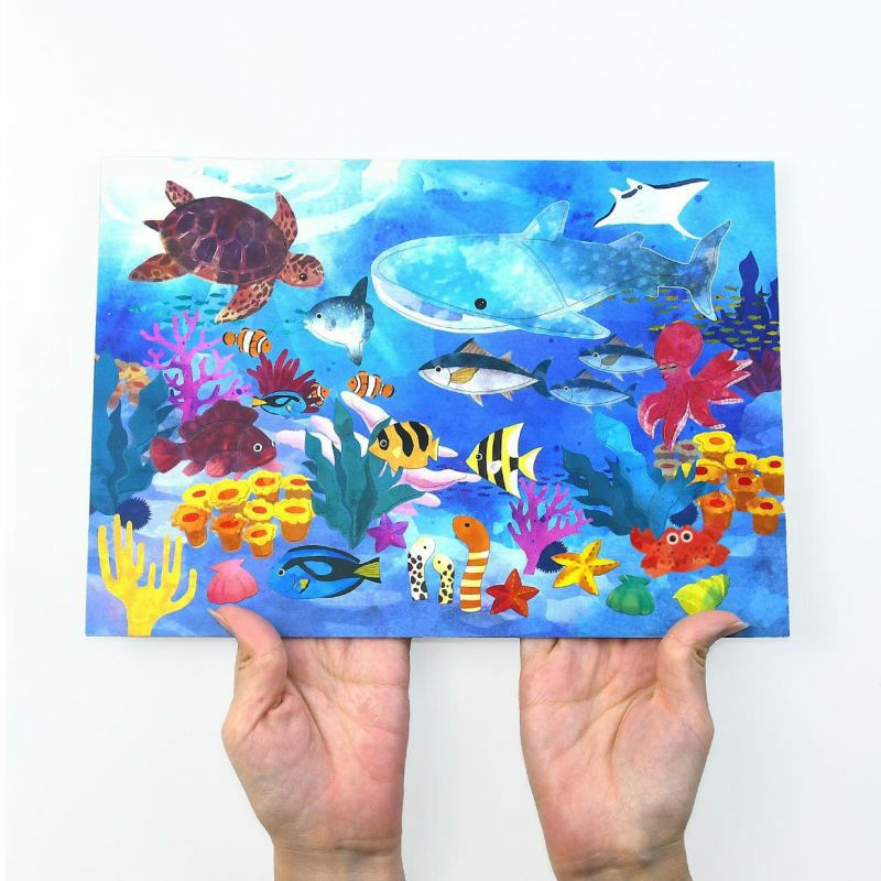擁有溫暖且溫柔氛圍的水彩畫風貼紙畫,海洋生物加入了!如同陽光閃耀般照亮水中游動的魚群的圖畫書,自然療愈。簡單手作,孩子和成人都能享受。