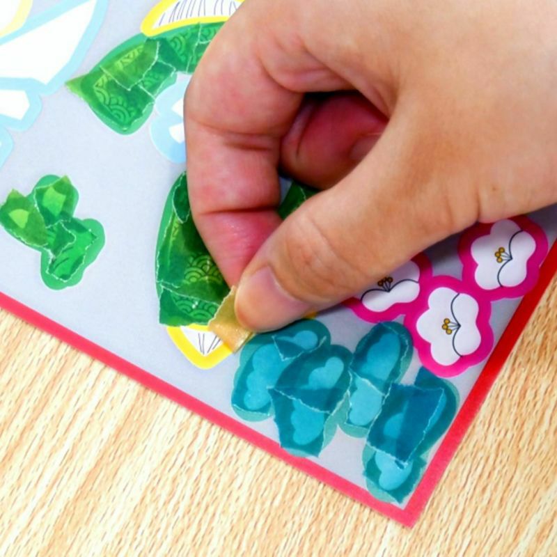 使用了漸層色彩美麗的8色撕貼畫貼紙。彩色貼紙撕貼的部位和尺寸不同,完成效果因人而異。