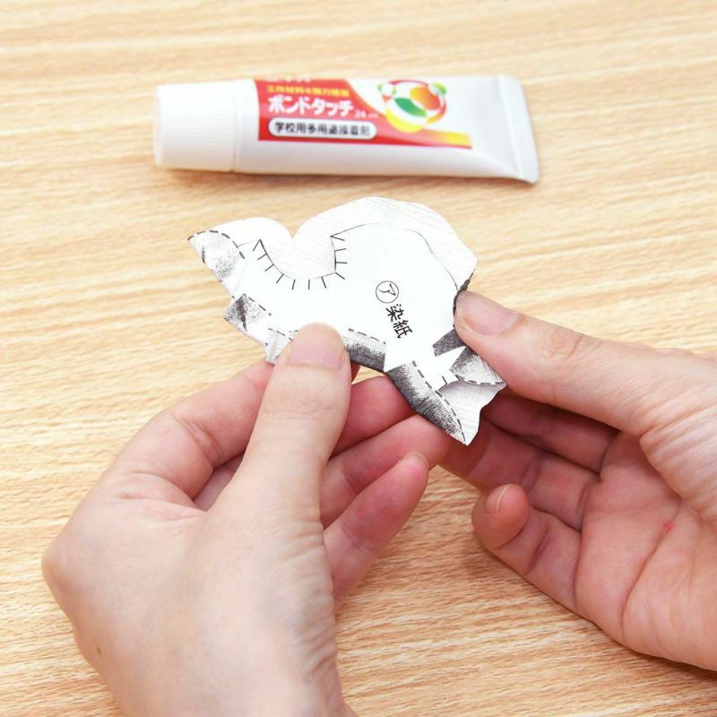 - 將摺紙部件從模版上取下,貼在揉紙和紙的中央(背面)。