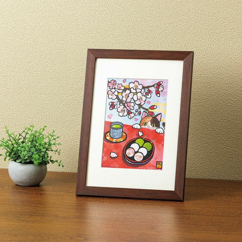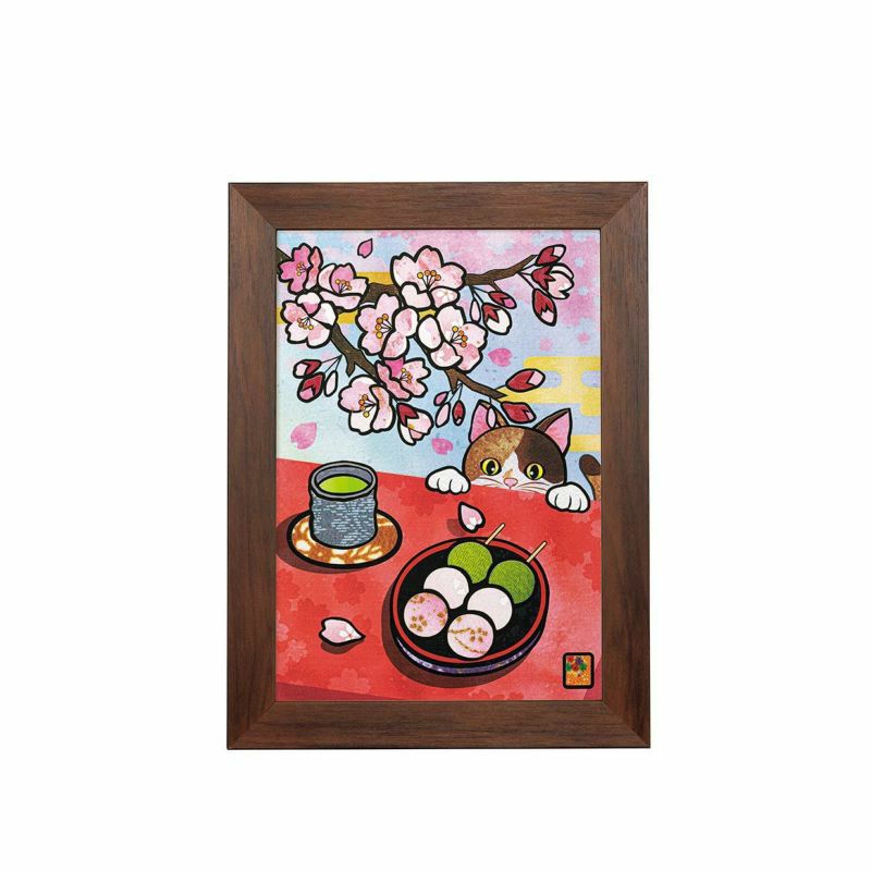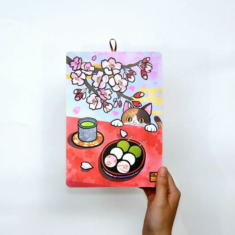 四月是盛開的櫻花和賞花圖案。探出腦袋的一隻貓咪正在注視著三色團子,非常幽默。