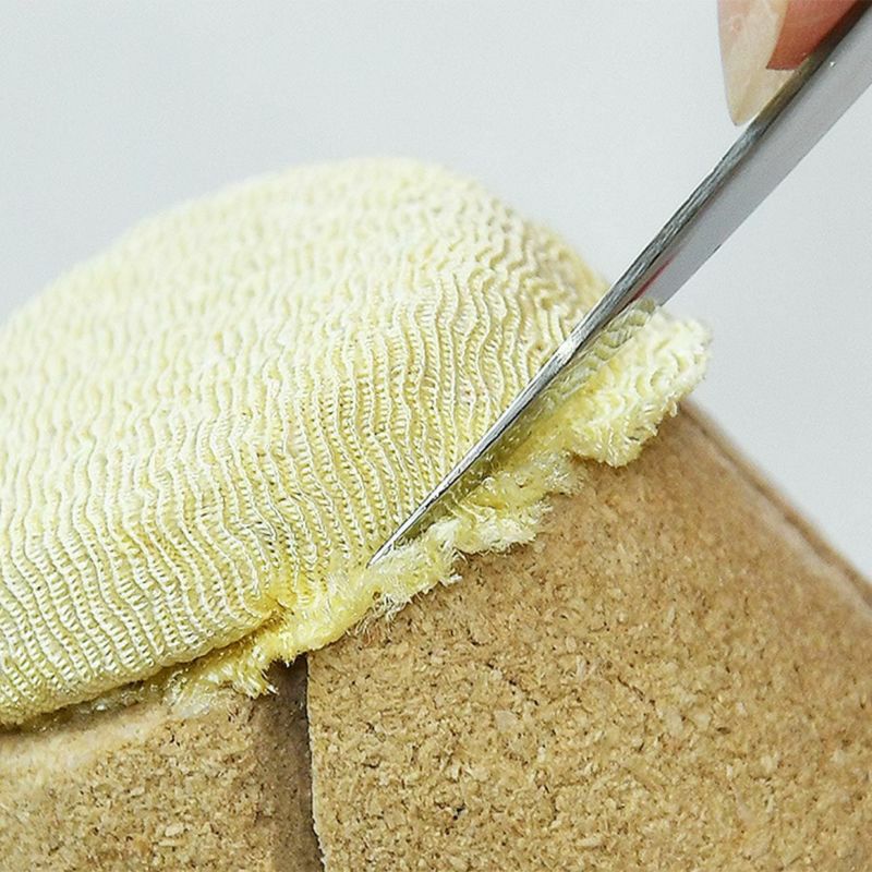 - 利用木目込み刮刀將布料嵌入溝槽,多餘部分用挫刀剪刀剪除。